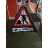 Triangular warning sign for litter collecting